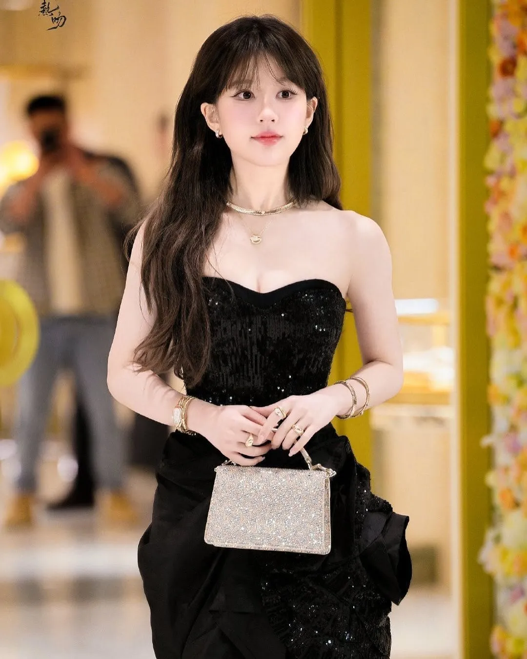 The black sequined outfit she wore exuded luxury, while the soft bangs on her forehead added a youthful and fresh impression. Her simple hairstyle perfectly complemented the sparkling gold jewelry, creating a combination of classic and modern elegance.