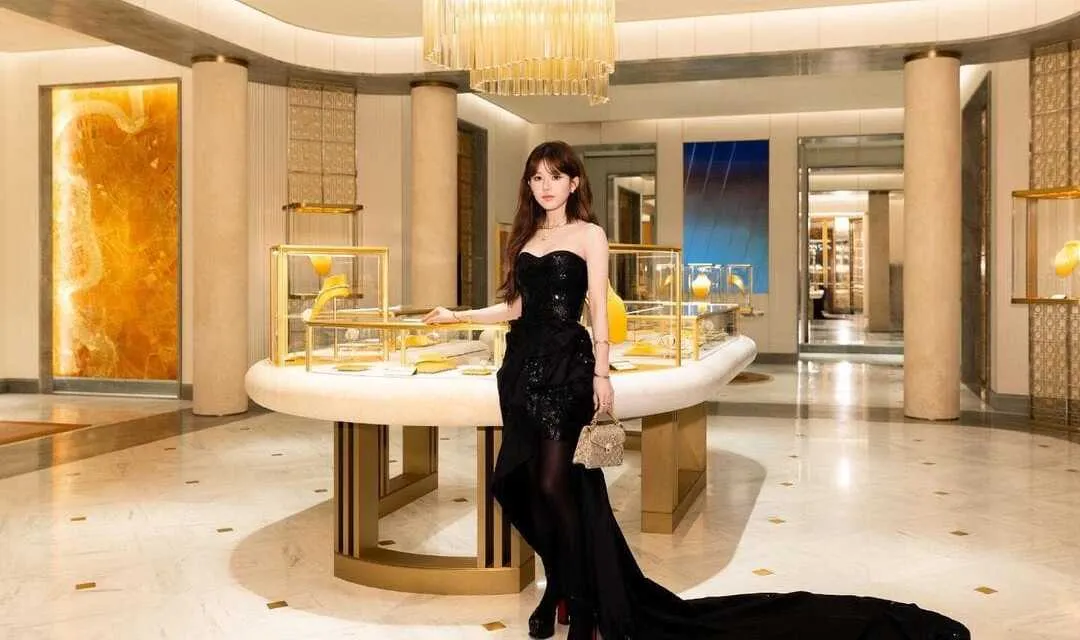 Zhao Lusi paired her outfit with a small silver handbag adorned with crystals. Gold jewelry accessories like necklaces and bracelets further emphasize the luxurious aura typical of the BVLGARI brand.