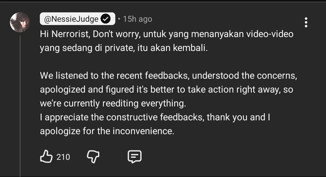 Nessie even made an apology in Japanese as netizens there have also provided harsh criticism towards the YouTuber and Indonesians.