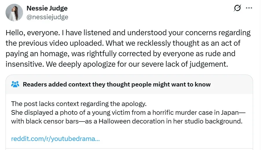 Nessie also made an apology on X. "Hello everyone. I have heard and understood your concerns regarding the video that was previously uploaded. What we thoughtlessly considered a form of tribute has rightly been corrected by many as an act that was disrespectful and insensitive. We sincerely apologize for our very serious lack of judgment," she wrote.
