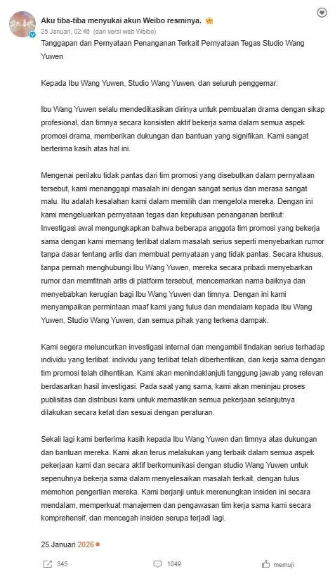 At 00:17 on January 25, 2026, Wang Yuwen's studio released an official statement affirming their firm stance. The studio assessed the actions of the publicity team as a deliberate attempt to sow discord and spread unfounded rumors about their artist.