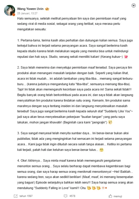 In her post, Wang Yuwen stated that she had accepted and agreed to the apology from the production team. She also emphasized that she did not want to blame the entire team for the mistake of one party.