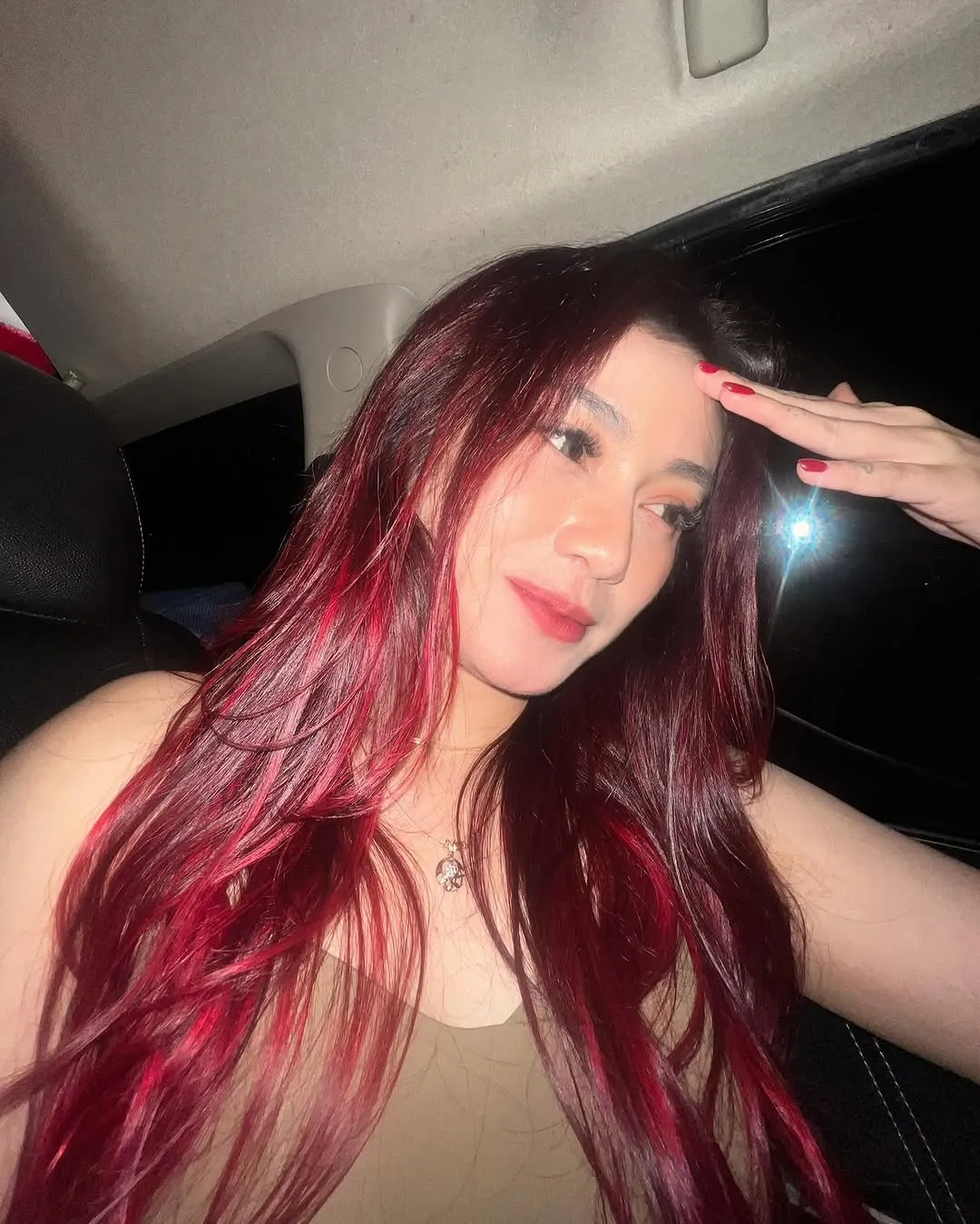 Dara The Virgin shared her latest photo that instantly became the center of attention. In her personal Instagram post, she showcases a bright red hair look that contrasts with the nighttime ambiance inside the car.