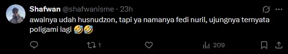 The character Hadi has triggered a variety of reactions from the public due to his actions of polygamy without the knowledge of his first wife. In response to this, Fedi Nuril tweeted on X in a joking manner asking netizens to be buzzers for Hadi's character. He requested netizens to spread the notion that Hadi is actually good but lonely, hence he engages in polygamy.