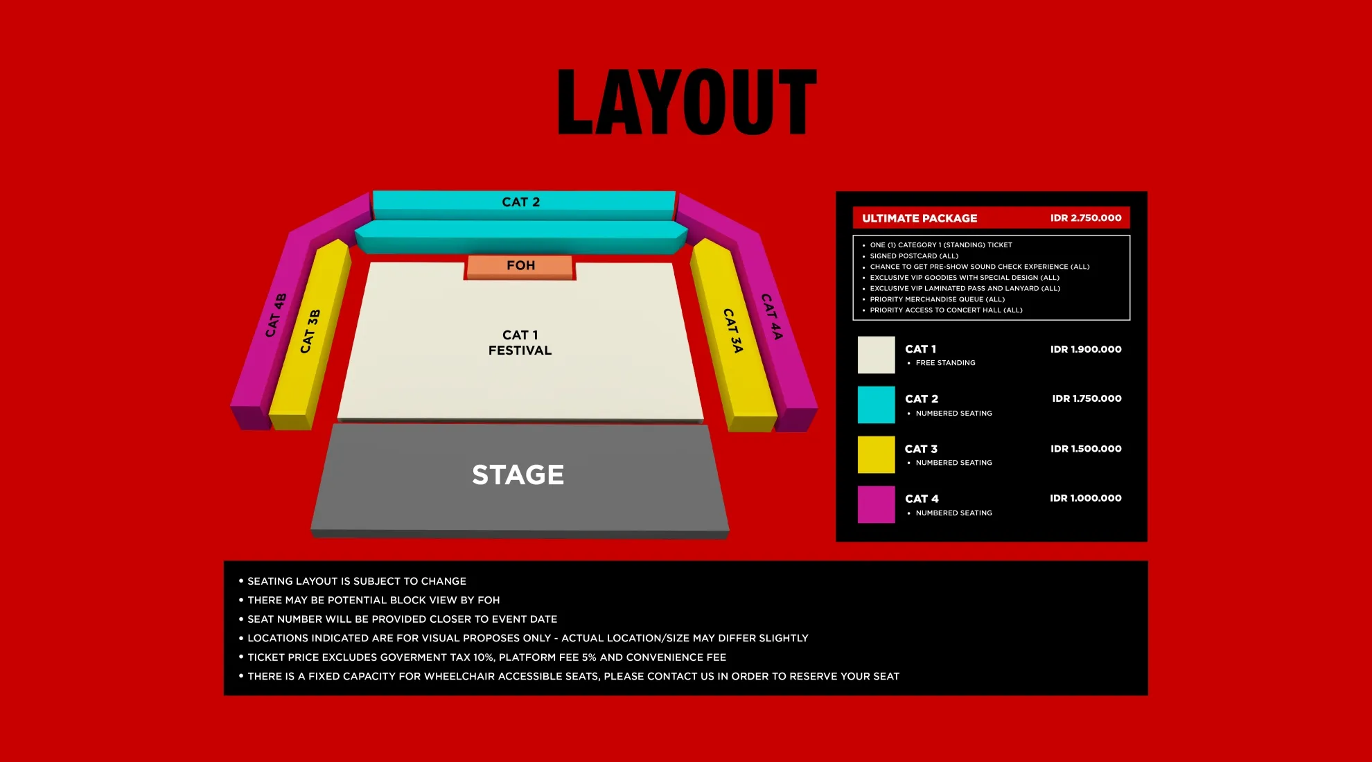 For the seating plan, you can see the image above, and each ticket purchase transaction is limited to a maximum of 6 tickets in the same category. Make sure to use a name that matches your identification card when purchasing tickets, okay!