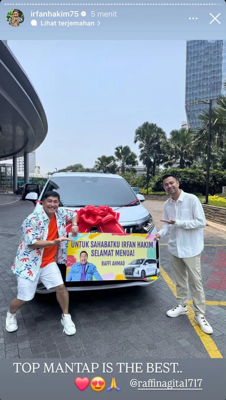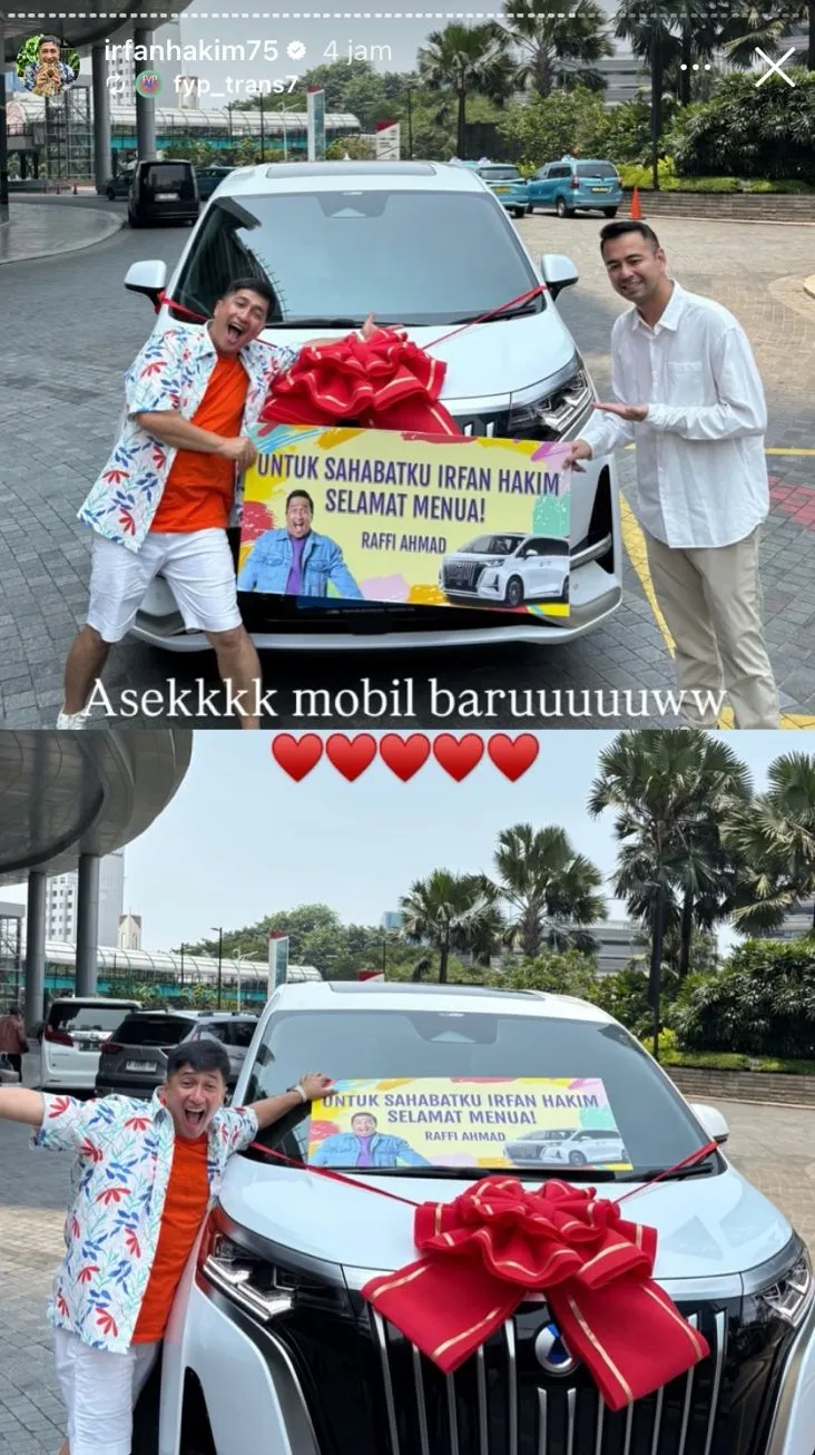 In a video uploaded on social media, a white Alphard car adorned with a large red ribbon is seen parked in front of the studio. A banner reading "For my friend Irfan Hakim, happy aging" is also displayed, adding to the festive atmosphere. Irfan Hakim himself looks on in disbelief. He then kneels while covering his face, showing how shocked he is to receive the gift.