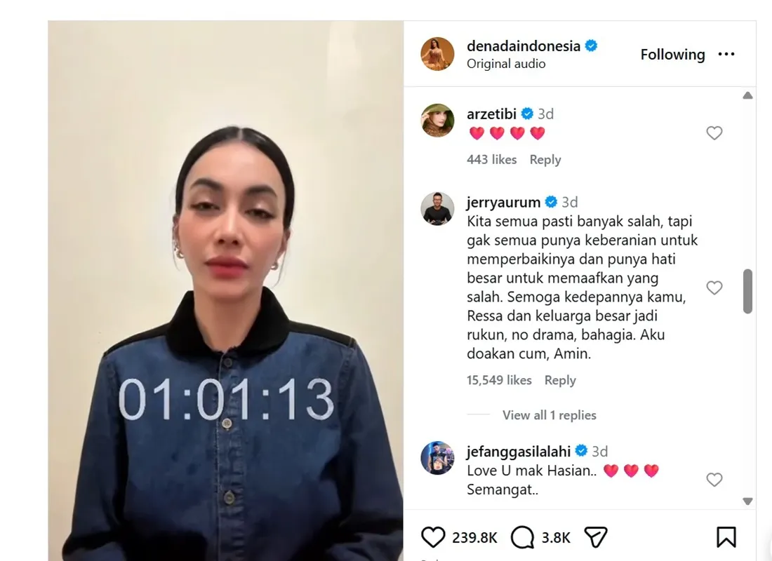 In the comments section, Jerry wrote that everyone must have mistakes in their lives. He appreciates Denada for having the courage to acknowledge her mistakes and try to fix them. He also hopes that the relationship between Denada, Ressa, and their extended family can run harmoniously without drama and full of happiness in the future.