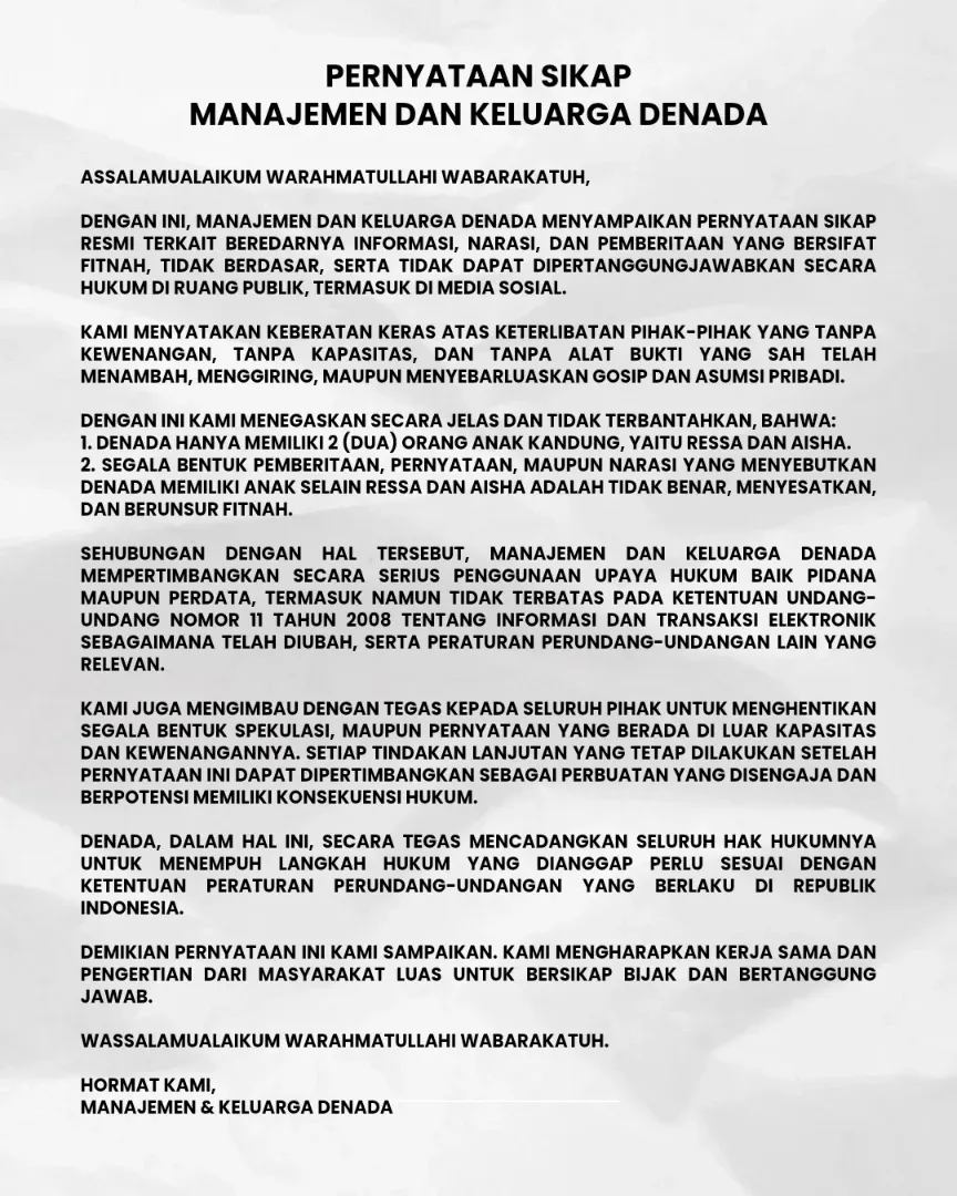 "Hereby, the management and family of Denada present an official statement regarding the circulation of information, narratives, and reports that are defamatory, unfounded, and cannot be legally justified in the public sphere, including on social media," wrote the management and family of Denada in their statement posted on Instagram @emiliacontessa57, on Sunday (8/2/2026).
