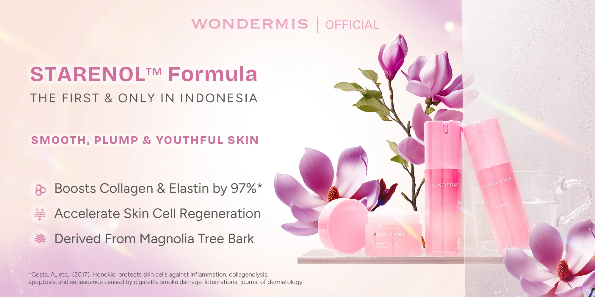 As a local skincare brand, Wondermis presents products specifically formulated for Indonesian women's skin. Its advantage lies in the patented Korean ingredient formula, STARENOL, known for making skin smoother, firmer, and looking youthful.