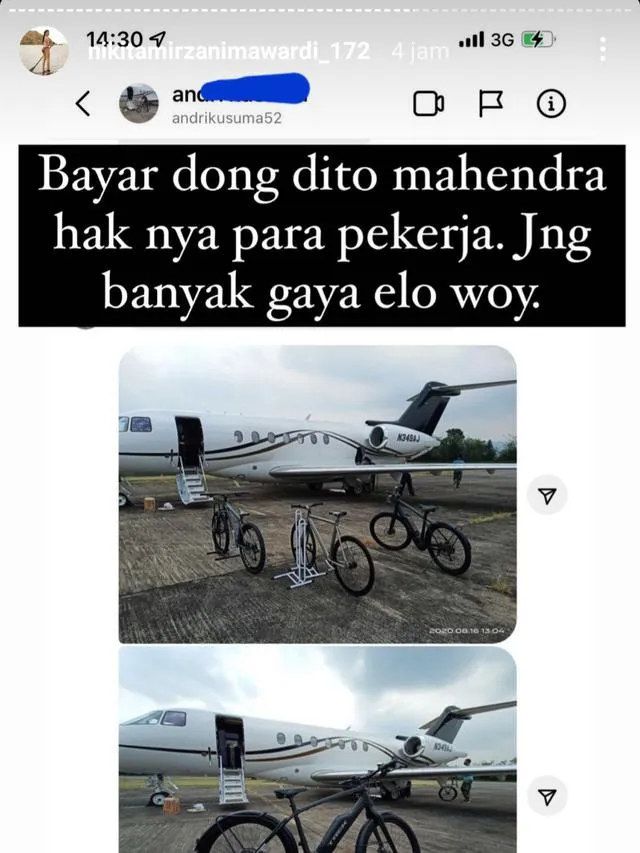 "Good afternoon, Nyai, let me introduce myself, I am Capt Andri, a former crew member of Dito Mahendra's private jet. These are Dito's debts to third parties and the crew. He hasn't paid the crew's salary for 6.5 months until now. The plane is Hawker 4000," AK said while attaching proof of Dito's debts that were censored.