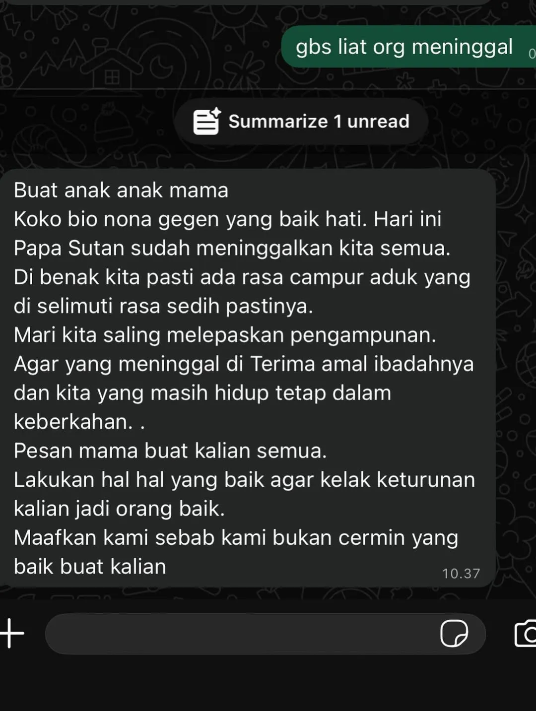 "To my children, Koko Bio and Nona Gegen, today Papa Sutan has left us all. In our minds, there must be a mix of feelings wrapped in sadness for sure," the message in the conversation reads.