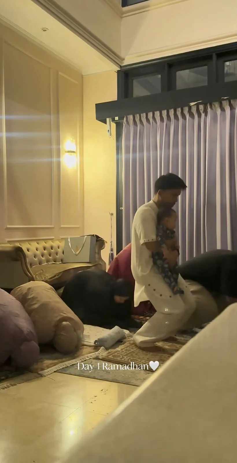 Thariq Halilintar appeared in a light-colored Muslim outfit, while Aaliyah wore a black mukena. During the moment of prostration, Thariq carefully laid his son down. After prostration, Arash was carried again by Thariq to continue the next rak'ah in the Tarawih prayer.