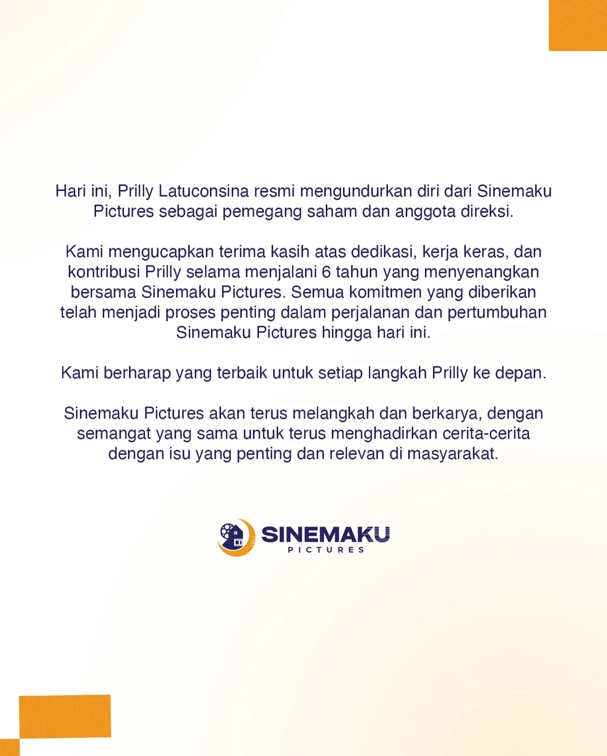 The day before, on Monday (19/1), Prilly Latuconsina officially announced her resignation from her position at Sinemaku Pictures. She made the statement directly through a post on her Instagram account. Prilly declared that she has relinquished her status as a shareholder and a member of the board of directors of Sinemaku Pictures, the production house she founded with Umay Shahab since 2019.