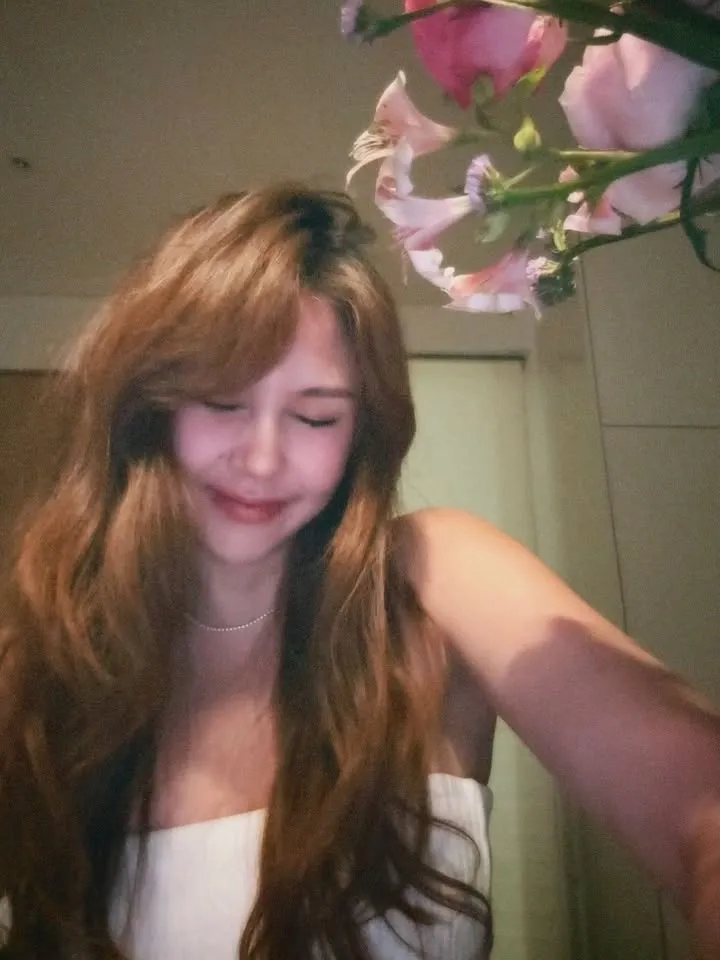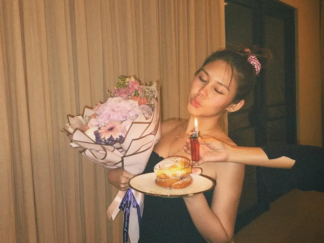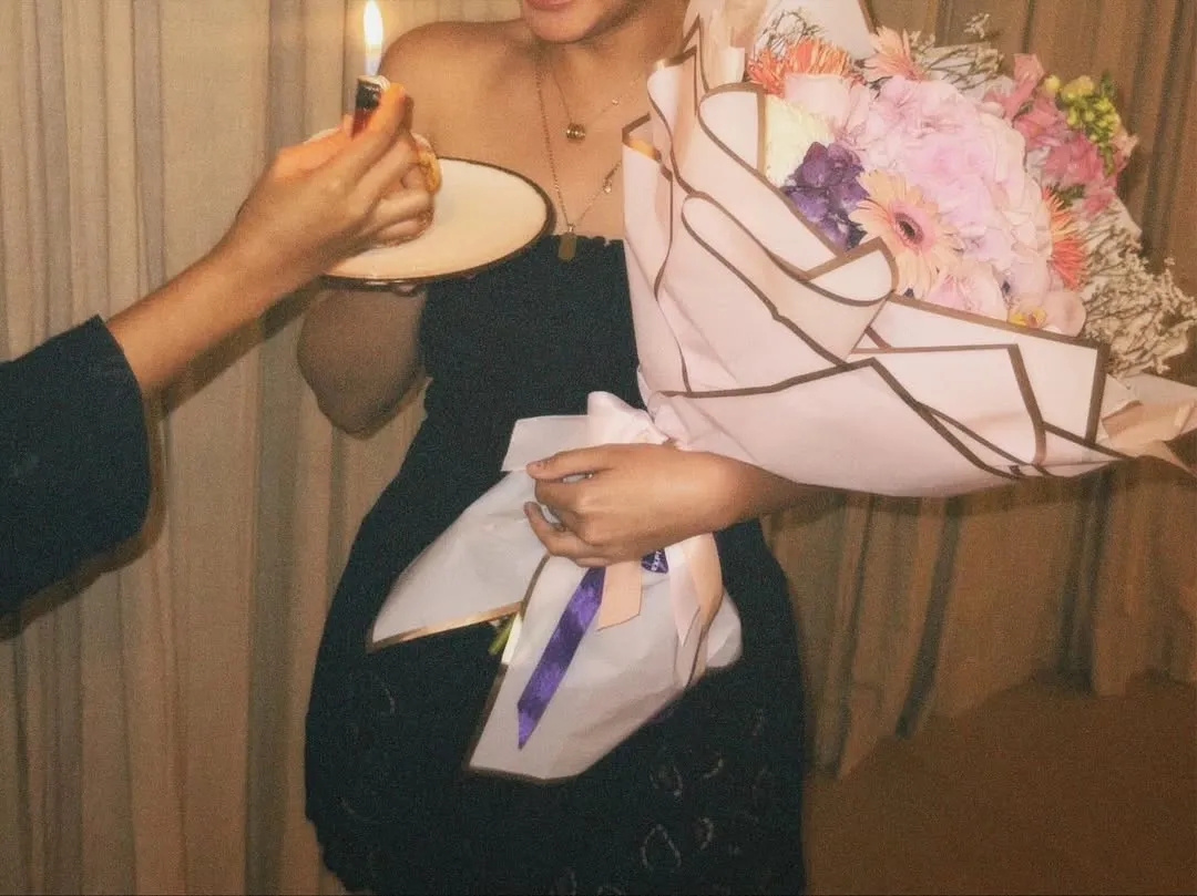 One of the most eye-catching details is the replacement of the birthday candle. Without a lavish party, she simply holds a large pastel-colored bouquet and a small plate of cake with a lighter instead of a candle. A hand can be seen lighting the lighter in front of Vanesha, creating a unique moment far from glamorous impressions.