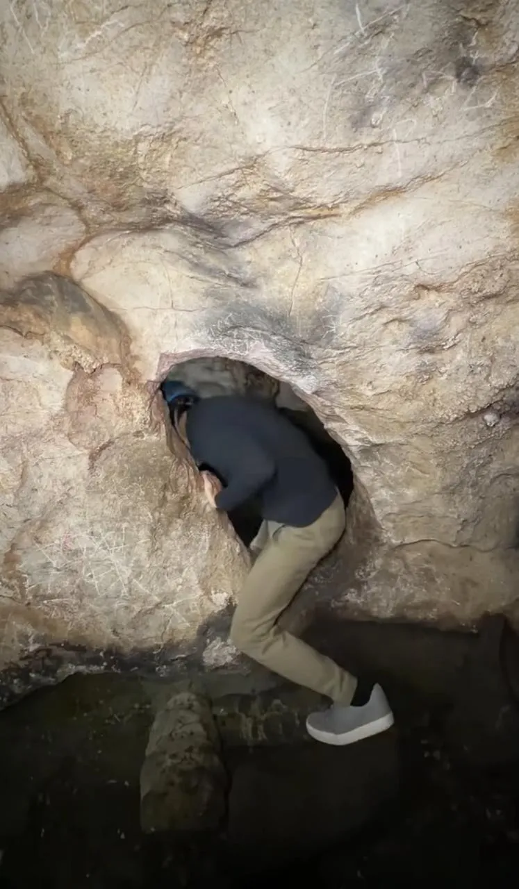 To reach the coffee shop location, visitors do not simply walk smoothly as if entering a regular restaurant. The video shows Jerome entering a dark cave filled with narrow passages and uneven surfaces, requiring handrails and high concentration throughout the journey.