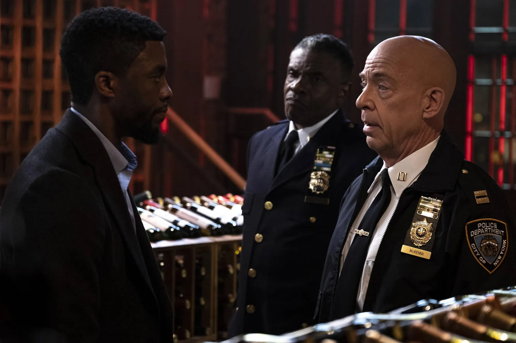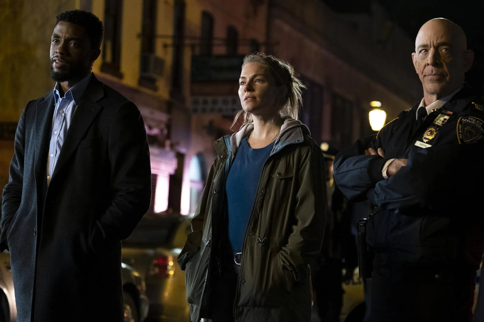 The movie 21 BRIDGES stars Chadwick Boseman as Andre Davis, Sienna Miller as Frankie Burns, and J.K. Simmons as Captain McKenna.