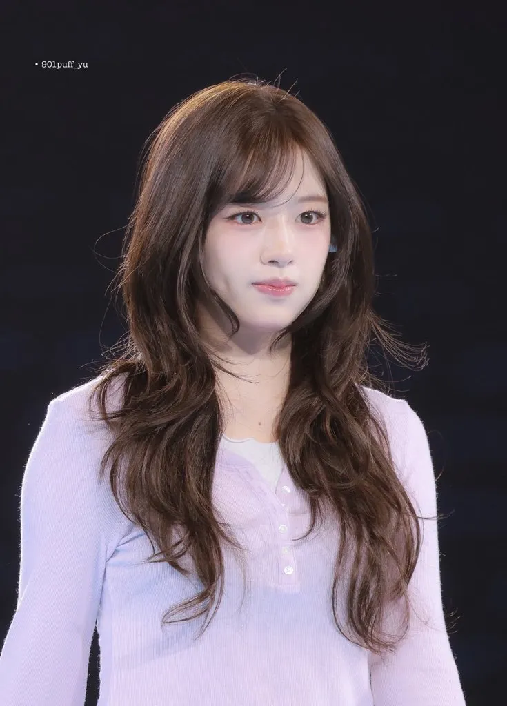 Visually, Yujin was seen sporting long brown hair with layers and wavy effects. The addition of side bangs gives a softer and more feminine impression compared to her previous image.