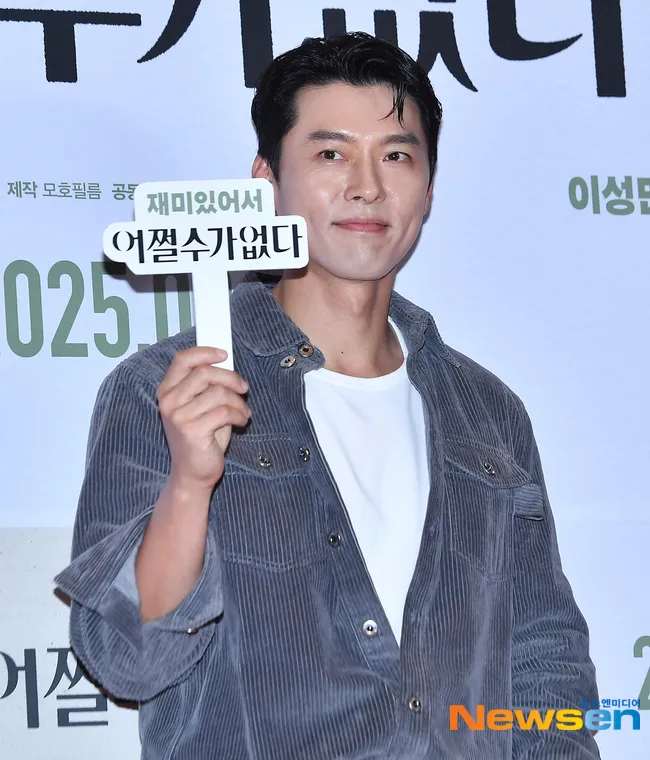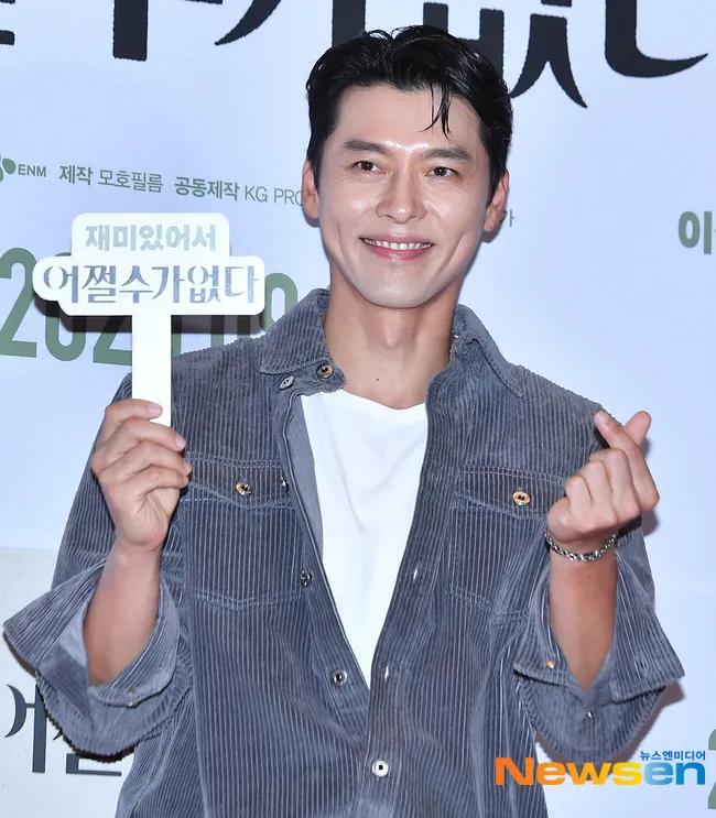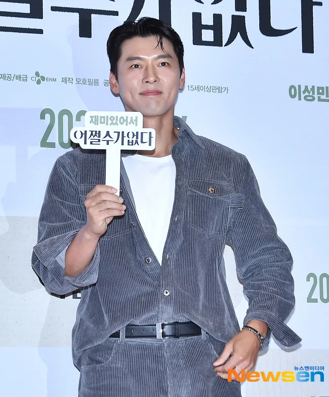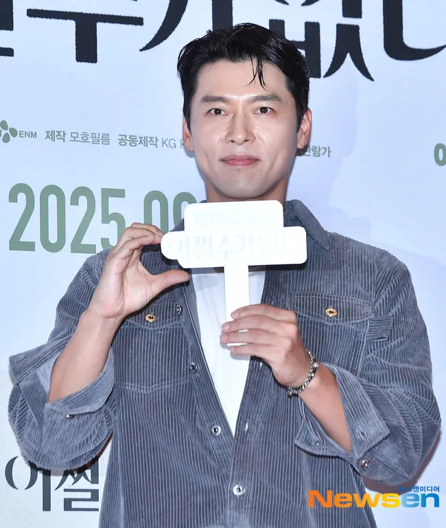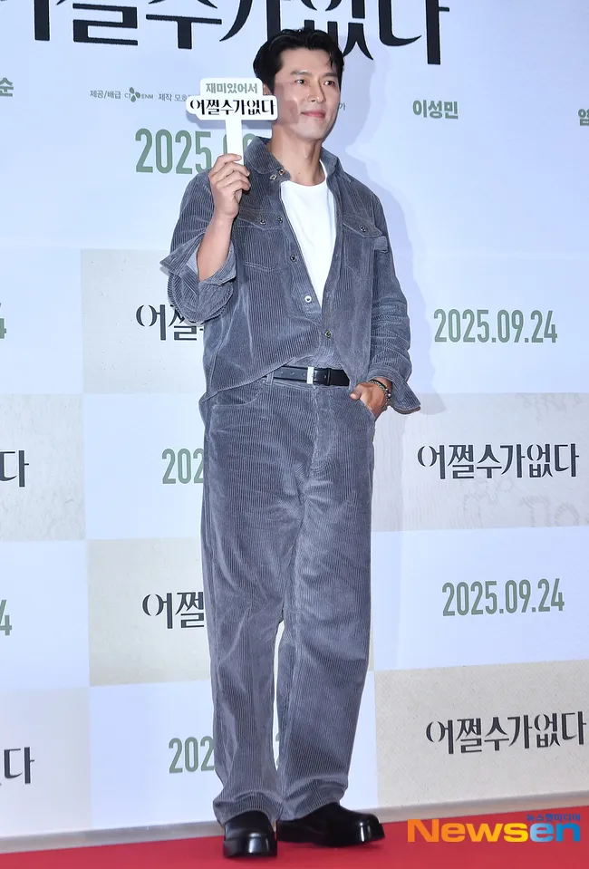 Hyun Bin holding a sign with the movie title 'NO OTHER CHOICE' in Hangul also looked adorable while giving a finger heart gesture.