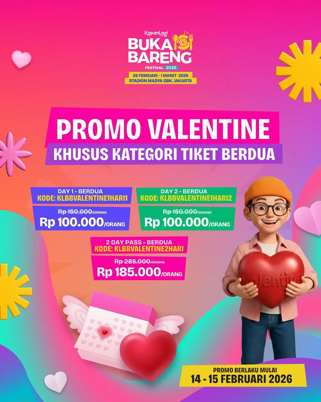 Kapanlagi.com - Welcoming the moment of Valentine's Day, KapanLagi Buka Bareng (KLBB) Festival 2026 presents a special Valentine promo with limited quota. This promo is valid only on February 14-15, 2026, with special price offers for the two-person ticket category.