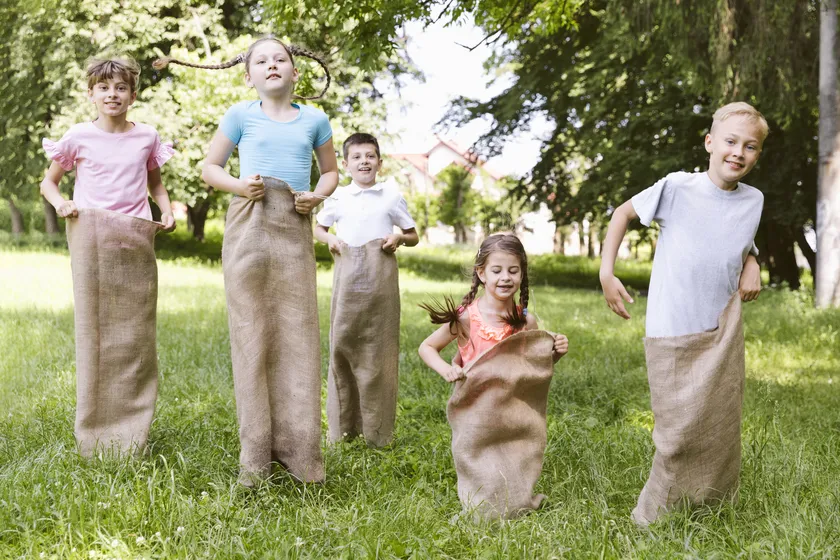 This game trains gross motor skills, agility, and balance, as well as fosters self-confidence and independence. Modifications can be made with a relay sack race, where participants are divided into teams to add an element of cooperation.